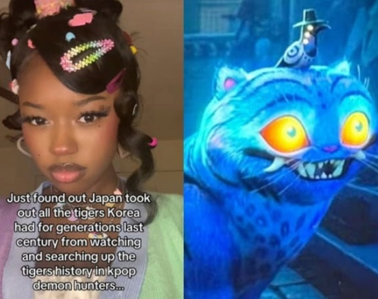 최근 한 해외 틱톡커는"'케데헌'을 보고 호랑이 역사를 찾다가 지난 세기에 일본이 한국의 모든 호랑이를 멸종시켰다는 사실을 알게 됐다"는 내용의 영상을 공개했다.