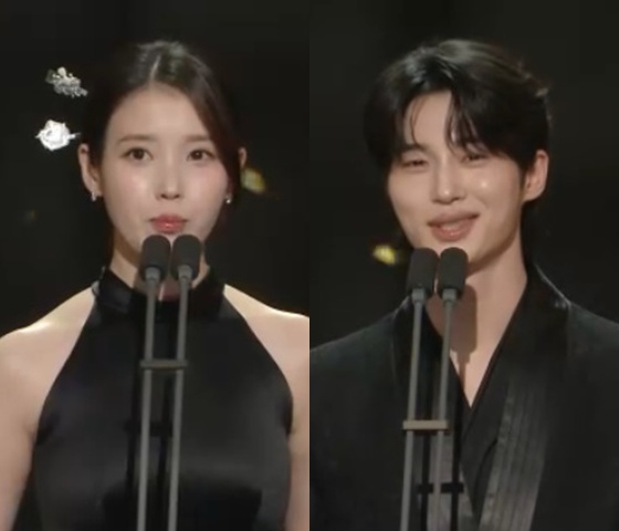 변우석도 "지은 씨도 오늘따라 더 멋지시다"라고 하자 아이유는 "내년 말의 해에 좋은 기운을 주고자 말 비녀를 꽂았다. 새해 복 많이 받으세요"라며 "내년에 나오는 저희 드라마도 예쁘게 봐 달라. 저희도 내년에 '올해의 드라마상' 후보에 올랐으면 좋겠다"라고 전했다.