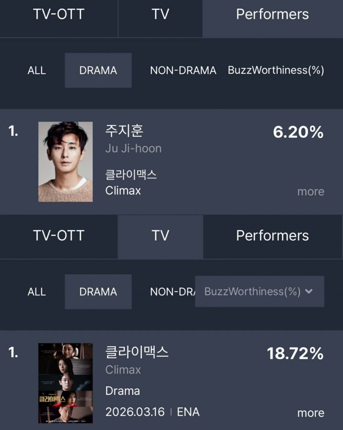 이 뿐 아니라 '클라이맥스'는 디즈니+ 공개 직후 '오늘 한국의 TOP 10 시리즈' 1위를 차지했으며, 네이버 엔터 '지금 많이 검색한 드라마', 키노라이츠 트렌드, 왓챠피디아 HOT 드라마 등 주요 플랫폼에서도 1위를 기록했다. 지난 한 해 '중증외상센터'로 넷플릭스 글로벌 TV쇼 비영어부문 1위에 오른 것을 시작으로 국내외 각종 지표를 휩쓴 주지훈이 차기작 '클라이맥스'로도 유의미한 성과들을 내고 있다.