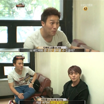 이때 또 다른 팀원 김승겸이 "목소리가 많이 불안해서 그러는데 이민용과 메인 부분을 바꾸는 것이 어떻겠느냐"고 컨디션이 좋지 않은 디케이소울에게 넌지시 물었다.