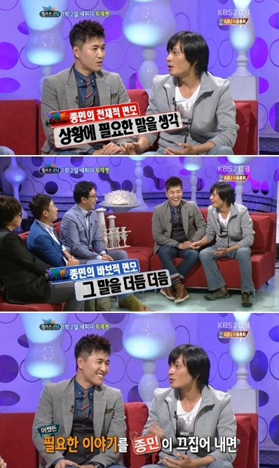 이날 '승승장구'에는 코요태(신지 김종민 빽가) 김종민이 출연해 예능 적응기 등 연예계 생활 뒷이야기를 솔직담백하게 털어 놨다.