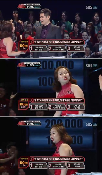 이날 100만원이 걸린 문제로 '밤 12시 직전에 택시를 타면 할증요금은 어떻게 될까?'가 출제됐다. 보기에는 1번 '할증요금이 붙지 않는다' 2번 '가는 도중 12시부터 적용 된다' 3번 '도착시간 기준이다'가 주어졌다.