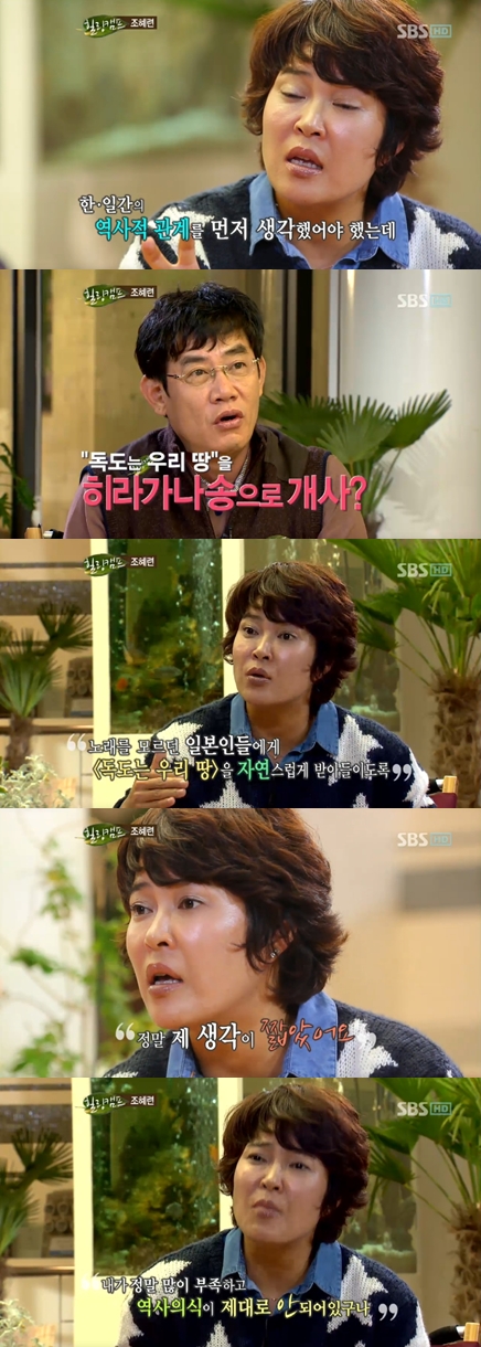 이어 조혜련은 '독도는 우리땅'을 '히라가나 송'으로 개사한 것에 대해 "당시에는 좋은 노래를 일본어로 알리면 더 좋다고 생각했었는데 그게 생각이 짧았던 것 같다"고 솔직하게 전했다. 그는 "우리나라를 알리자는 취지로 시작했는데 역사의식이 부족해 역효과를 낸 것 같다"고 덧붙이며 '히라가나 송' 논란 이후로 6년 만에 일본 활동을 접었다고 밝혔다.