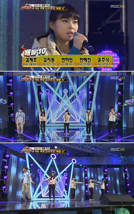 이날 참가자 김제호, 김지원, 전하민, 한혜진, 윤주식이 속한 10대 팀 '배틀10'은 김태우의 '사랑비'를 부르며 발랄하며 꽉찬 무대를 꾸몄다.