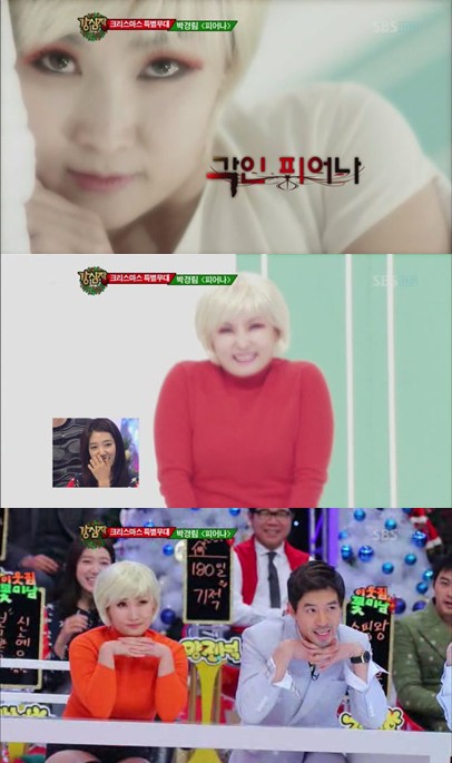 박경림은 25일 오후 방송된 SBS '강심장'의 크리스마스 특집에서 가인의 뮤직비디오 속 모습을 그대로 재연한 '각인'으로 깜짝 등장해 시청자들의 놀라움을 자아냈다.