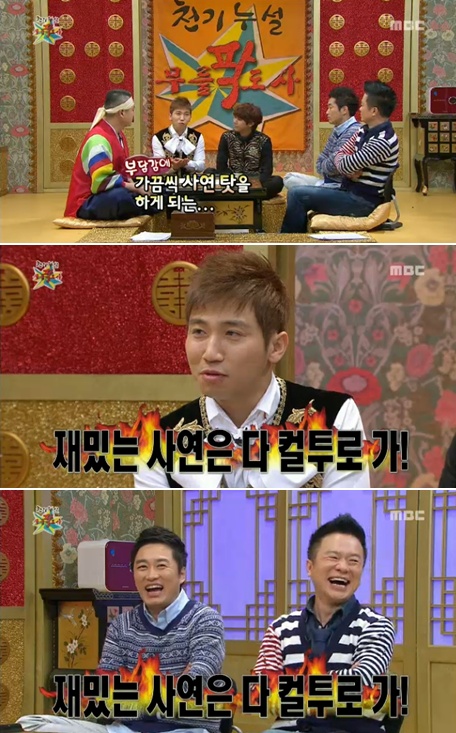 17일 오후 방송된 MBC 예능프로그램 '황금어장- 무릎팍 도사'에서는 컬투인 정찬우와 김태균이 출연해 라디오 FM 청취율 1위에 빛나는 '두시탈출 컬투쇼'의 베스트 사연을 공개했다.