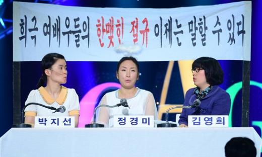 KBS 2TV '개그콘서트'(이하 '개콘')의 '희극여배우들'(정경미 박지선 김영희) 코너는 지난해 7월 첫선을 보였다. 사진기자들의 플래시가 터지는 기자회견장을 배경으로 마스크를 쓴 개그우먼들이 자신의 불만을 개그로 승화, 웃음을 안겼다. "저는 ~가 아닙니다", "누구를 위한 ~라 말입니까" 같은 유행어도 만들어 냈다.
