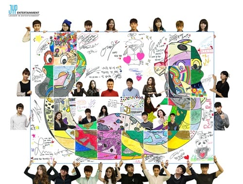 JYP엔터테인먼트는 9일 공식 페이스북과 트위터 등 SNS를 통해 계사년 설을 맞아 전체 소속 아티스트들이 함께 그린 '뱀' 그림과 메이킹 영상을 공했다.