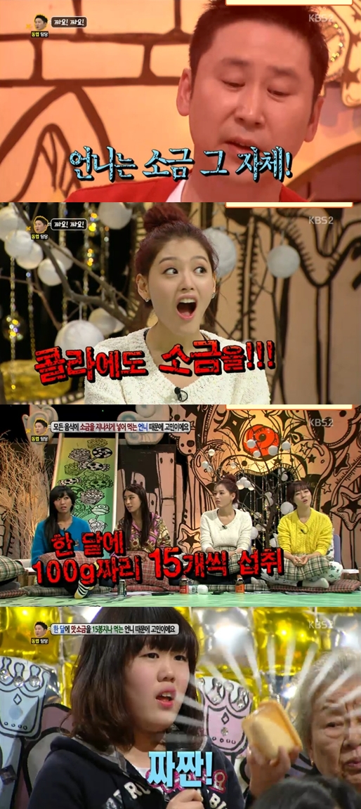 언니는 소금을 많이 먹게 된 계기에 대해서 "어렸을 때 할머니의 여관에서 자랐다. 같이 놀 친구가 없다보니 심심하다고 할머니를 보챘다. 할머니가 '심심하면 소금 먹어라'고 말해서 먹기 시작했다. 먹다보니 맛있더라"고 설명했다.