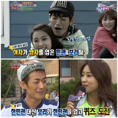 보라는 "'청춘불패2'를 할 때 한민관이 저를 못 업어서 제가 대신 업은 적이 있다"고 말했다. 곧바로 지난해 방송된 '청춘불패2' 자료 화면이 나왔다. 당시 다른 멤버들은 남자 게스트들이 업었으나, 보라만 한민관을 업고 퀴즈에 임했다.