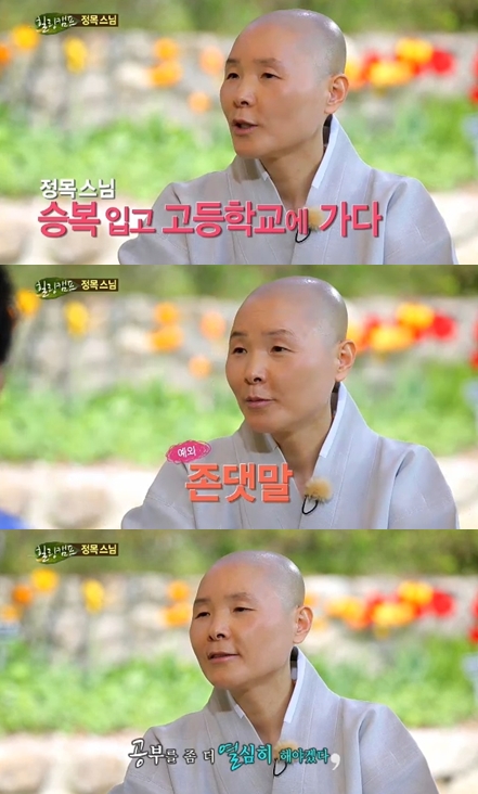 정목스님은 "선생님들이 존댓말을 하셨다"며 "'정목스님 이번에 왜 성적 떨어지셨어요? 절에서 공부할 시간이 없으셨어요?'라고 하셨다"고 말했다.