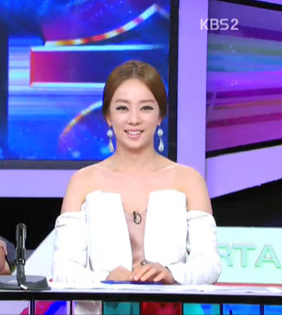 '연예가중계' MC인 박은영 아나운서는 22일 오후 생방송에 쇄골이 드러난 상의을 입고 나섰다. 특히 이 의상은 독특한 디자인에 가운데 부분이 살색과 비슷해 더욱 이목을 집중시켰다.
