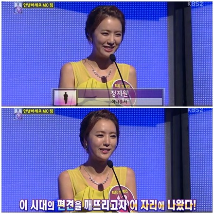 정 아나운서는 "엄청 떨렸다. KBS를 대표해 홀로 출전했기 때문이다. MC인 한석준 선배에게 '아나운서실의 명예를 지킬 수 있을까요?'라고 물으니 선배가 '너의 명예를 지키는 것이 본전이다'고 말씀해주셨다"고 말하며 웃었다.
