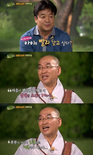 법륜스님은 이에 대해 "아이를 갖고싶다는 것은 마음이고 임신은 생물학적인 부분이다"며 "긴장을 놓고 부부가 가장 서로 좋은 관계, 마음이 편안한 관계를 유지할 때 입태할 조건이 커진다"고 말했다.