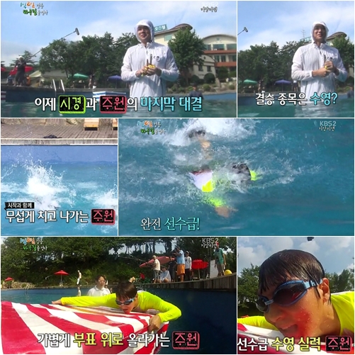 대결을 알리는 호루라기 소리가 나자 주원은 빠른 스피드로 물살을 치고 나갔다. 주원의 빠른 스피드에 나머지 멤버들은 감탄을 금치 못했고 수영 선수 못지않은 실력을 발휘한 주원이 최종 우승을 차지했다.