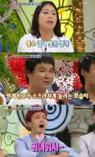이에 MC들이 "일부러 남자친구가 짓궂게 하는 거냐"고 묻자 "그런 것 같기도 하다. 덩치가 좀 큰 편인데, 겁이 많아서 일부러 그럴 수도 있다"고 밝혔다.