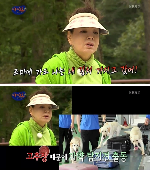 김수미는 "그때 국경에서 고추장 때문에 탐지견이 출동했었다. 우황청심환도 발각돼서 '머리 아플 때 까서 먹으면 좋다'고 손짓발짓 했더니 또 개가 출동했었다"고 말해 모두를 폭소케 했다.
