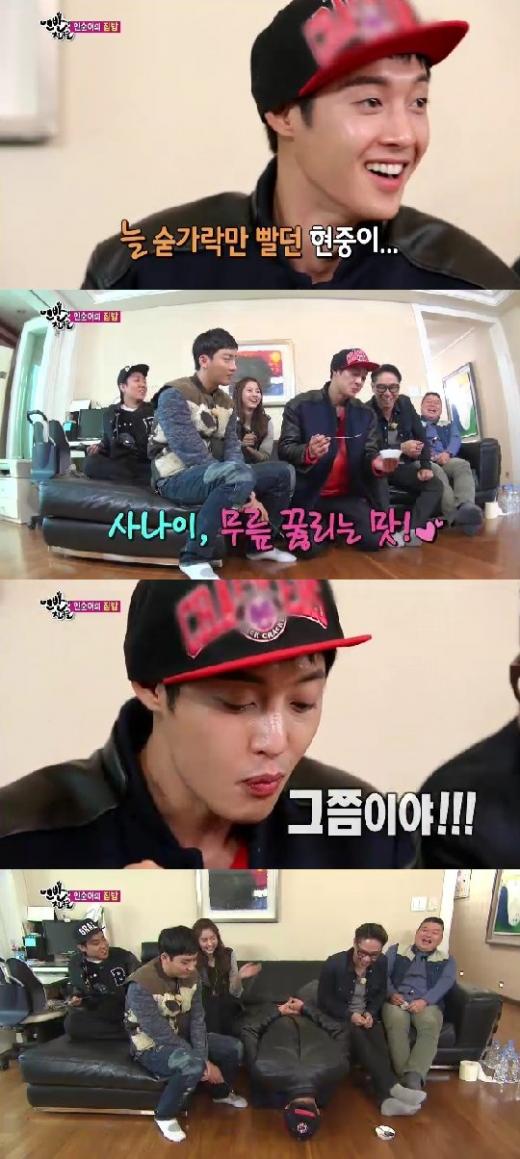 항상 숟가락 빨기에 바빴던 김현중이 연이어 정답을 맞추며 '배추 우거지 민물 새우탕' 한 입 시식에 나섰다.