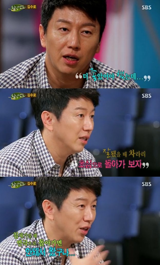 김수로는 지난 2일 오후 방송된 SBS 예능프로그램 '힐링캠프-기쁘지 아니한가'(이하 '힐링')에 출연해 "SBS '신사의 품격'에서 내 연기가 마음에 안 들더라. 다시 초심으로 돌아가 보고자 하는 마음에 연극 무대로 갔다"고 밝혔다.