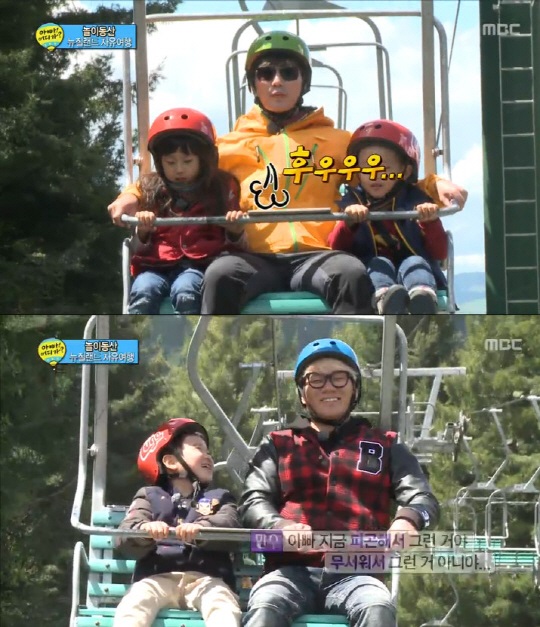 이후에도 송종국과 윤민수는 리프트를 타고 올라오는 게 무서워 처음에는 아예 무동력 카트에 오르지도 못하는 모습을 보였다. 이 과정에서 지아는 아빠가 함께 타지 못한다다는 말에 실망과 아쉬움을 속에 울기까지 해 다시 한 번 웃음을 선사했다.