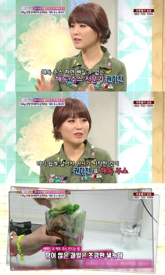 이에 권미진은 "저는 해독 주스로 살을 뺐다기보다 해독주스로 다이어트에 도움을 받았다"며 "다이어트 부작용을 줄이기 위해 처음에는 몸에 좋다는 과일과 채소를 우걱우걱 씹어먹다가 한 데 갈아서 마셨다"며 해독주스를 마시게 된 계기를 밝혔다.