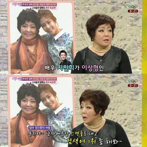17일 오전 방송된 KBS 2TV '여유만만'에서는 배우 이윤지 엄마 정진향 씨가 출연, "윤지가 내 이상형 지진희 같은 남자배우하고 스캔들이 났으면 좋겠다"고 털어놨다.
