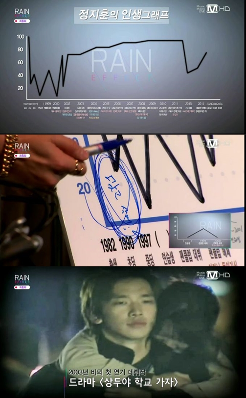 23일 오후 방송된 Mnet '레인이펙트'에서 비는 자신의 출생부터 현재까지의 사건들을 망라한 '정지훈의 인생그래프'를 선보였다.