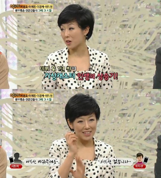 이에 MC들은 “당시 이익선의 기상예보를 보기위해 뉴스를 시청했던 남성팬이 많았다"고 이익선의 인기를 입증했다.