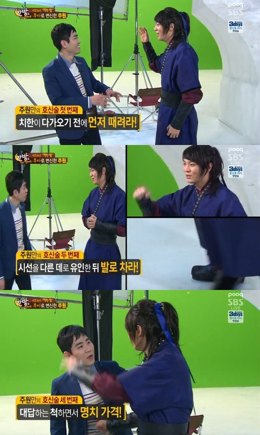 이어 주원은 "시선을 다른 데로 유인한 뒤 발로 차라"며 직접 발차기 시범을 보였다. 또한 그는 "대답하는 척하면서 명치를 가격하라"며 리포터의 명치를 치려고 해 웃음을 선사했다.