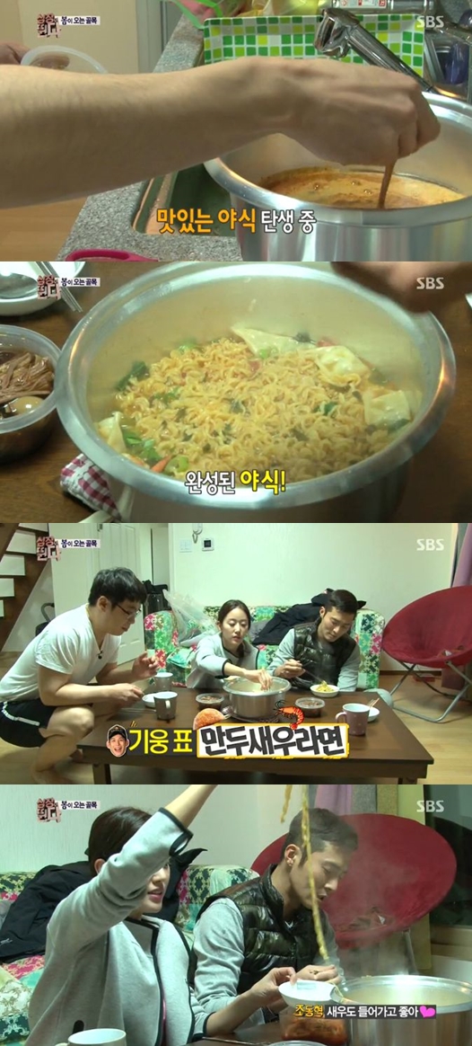 박기웅이 선보인 야식의 이름은 '만새라면'. 박기웅은 "청양초를 풀고, 파를 썰고, 만두와 칵테일 새우를 넣은 뒤 참기름 서너 방울로 마무리한다"며 모두를 만족시킨 '만새라면'의 레시피를 소개했다.