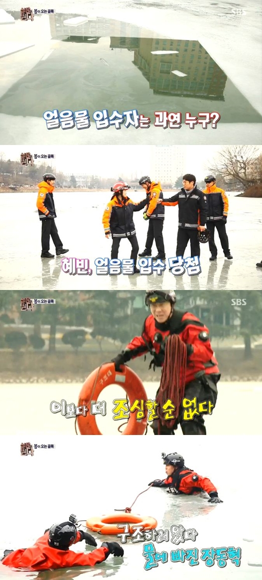 개인기로 입수자를 선별하던 장동혁은 장기로 어색한 무반주 댄스를 선보인 전혜빈에게 요구조자 역할을 맡겼다. 결국 얼음물에 입수한 전혜빈은 "살려 달라"며 연기를 했고, 장동혁은 전혜빈을 구조하기 위해 얼음판을 조심조심 걸었다.
