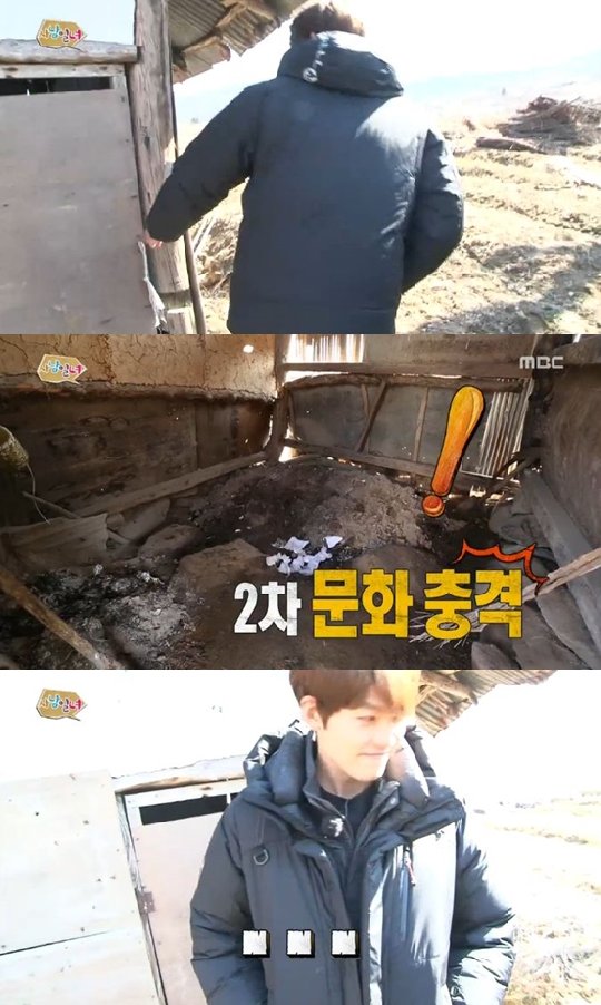 이날 김우빈은 올챙이 부모님 댁을 둘러보다 재래식 화장실을 발견했다. 그는 화장실 문을 열고 내부를 확인한 뒤 경악했다. 생각보다 훨씬 열악한 환경에 충격을 받은 것.