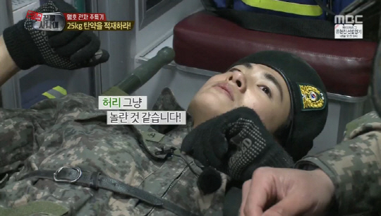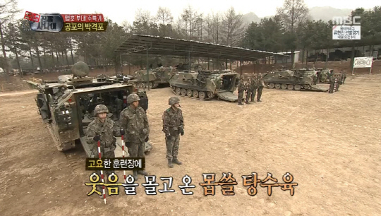 60억원 상당의 K1A2 전차 승무원 교육을 받던 도중에는 작은 소리의 복명복창 때문에 호랑이 교관으로부터 팔굽혀 펴기 얼차려를 받아야했고, 임무 이행에 실패해 25kg 모의탄을 들고 뛰기까지 해야 했다.