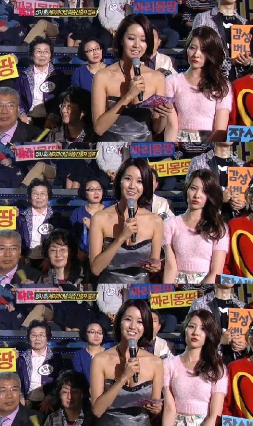 유 아나운서는 어깨와 가슴라인이 그대로 드러난 은색 튜브톱 드레스를 입고 등장해 객석에서 방송을 이어 나갔다.