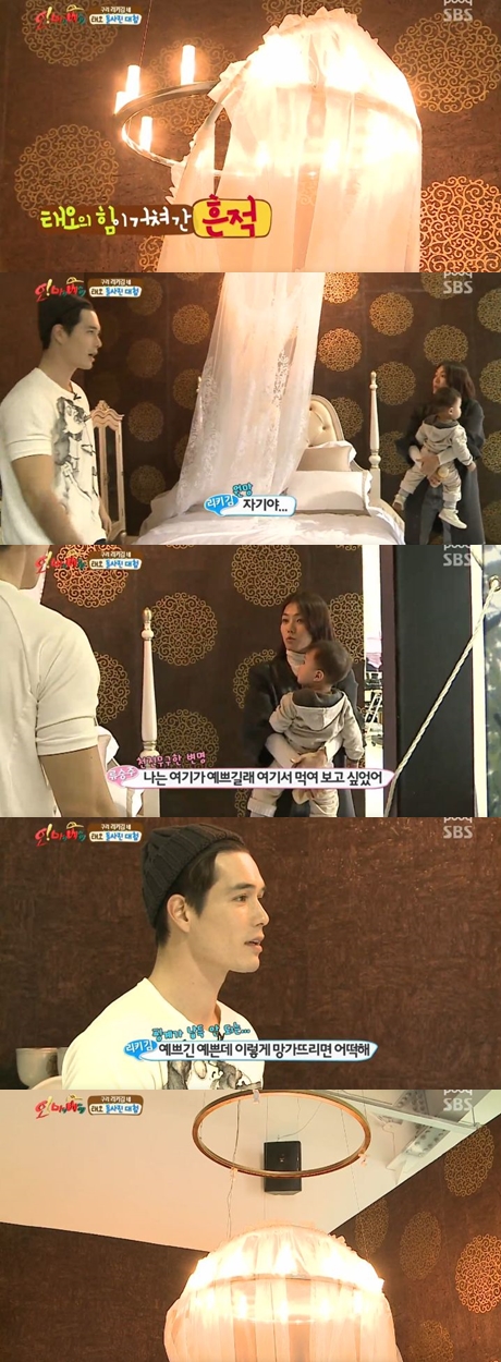 이날 태오의 본격적인 돌 사진 촬영에 앞서 류승주는 태오에게 밥을 먹이려 했다. 류승주는 캐노피가 설치된 화려한 침대에서 태오에게 밥을 먹여주고 싶었지만 태오가 커튼을 강하게 잡아당겨 커튼이 부서졌다.