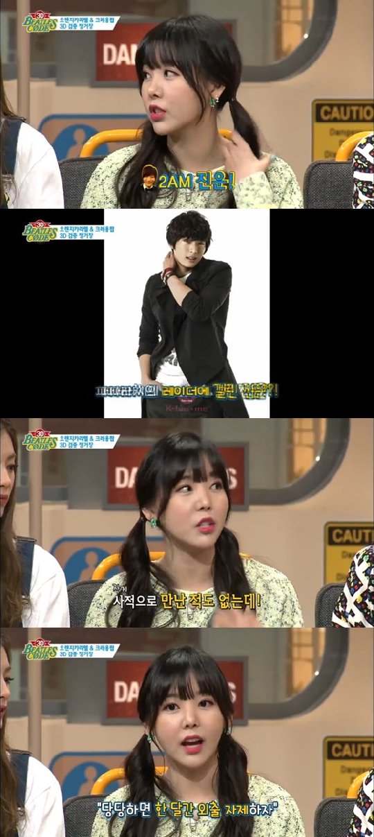 유닛그룹 오렌지캬라멜(리지 나나 레이나)의 레이나가 2AM의 진운과 났던 열애설 때문에 소속사로부터 한 달간 외출금지를 당했다고 고백했다.