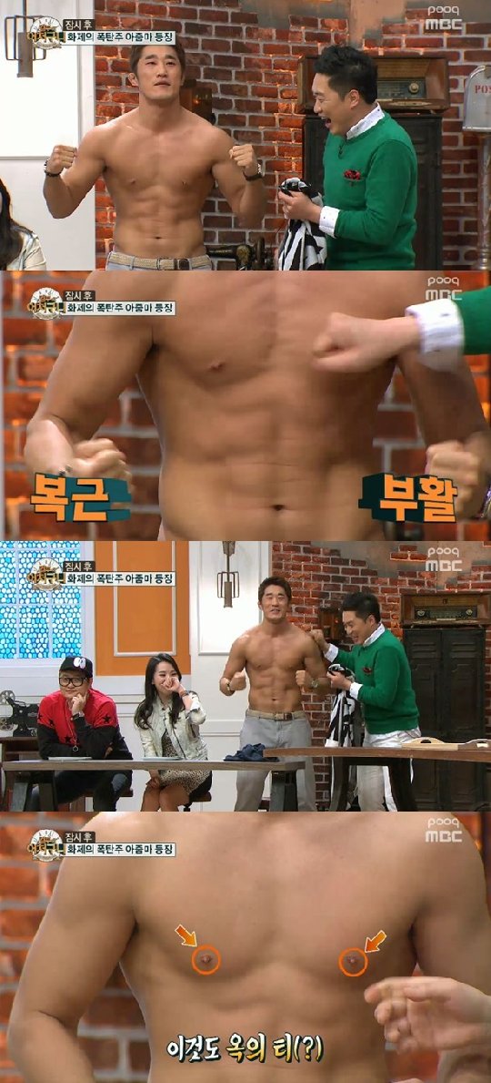 그는 운동으로 다져진 탄탄한 근육질 몸매를 공개해 출연자들의 환호를 받았다. 그러나 컬투는 "몸에 비해 젖꼭지가 작다. 그게 '어처구니' 없다"고 말해 웃음을 자아냈다.