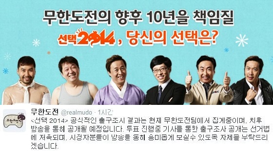 '무한도전'은 22일 공식 트위터를 통해 "선택 2014 공식적인 출구조사 결과는 현재 무한도전 팀에서 집계중이며, 차후 방송을 통해 공개 될 것"이라며 "투표 진행 중 기사를 통한 출구조사 공개는 선거법에 저촉되며, 시청자분들이 방송을 통해 흥미롭게 보실 수 있도록 자제를 부탁드린다"고 밝혔다.
