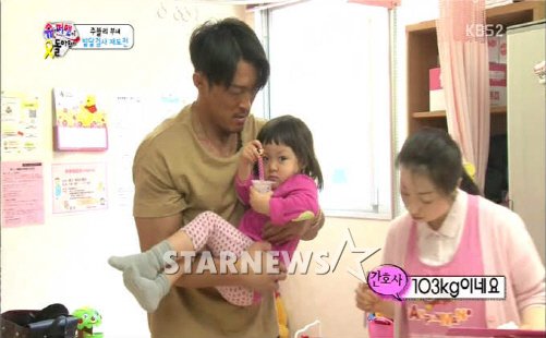 이날 방송에서 재검사에 나선 추성훈은 아예 사랑을 번쩍 들고 몸무게를 재는 등 딸 바보 모습을 여실히 드러냈다. 사랑은 아빠를 닮아 체력이 강한 것으로 조사됐다.