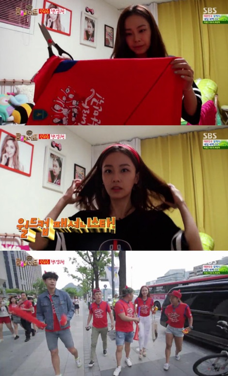 홍수현은 22일 오후 방송된 SBS 예능 프로그램 '일요일이 좋다-룸메이트(이하 룸메이트)'에서 서울 광화문 거리응원에 나서기 위해 붉은 티셔츠를 리폼했다.