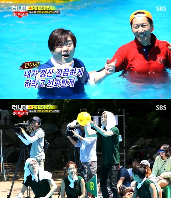 이날 멤버들은 '런닝 아이돌' '원조 아이돌' '뉴 아이돌' 팀으로 나뉘어 삼각형과 관련된 미스터리를 푸는 게임을 진행했다. 첫 관문은 수영장에서 진행된 '삼각 수중 농구'였다. 치열한 접전 끝에 '뉴 아이돌' 팀이 첫 관문에서 승리를 맞봤다.