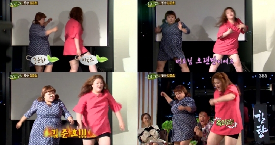 이날 방송에서 이국주와 홍윤화는 선배이자 소속사 사장인 김준호를 위해 깜짝 방문해 씨스타의 '터치마이바디' 댄스를 선보였다.