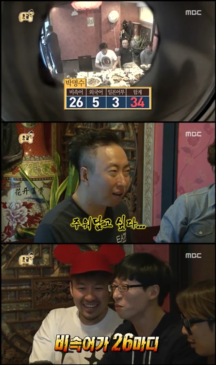 이날 박명수는 압도적인 비속어 사용으로 1위를 차지했다. 박명수는 비속어 26번, 외국어 5번, 일본어투 3번 등 총 34번 언어를 파괴해 당당히(?) 1위에 올랐다.