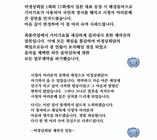 이어 "최종작업에서 기미가요를 세심하게 걸러내지 못한 제작진의 잘못입니다. 이에 모든 책임을 통감하며 '비정상회담'의 책임프로듀서 겸 연출이 보직해임 경질되었고 음악을 채택한 외주 음악감독에 대한 모든 업무계약을 파기했습니다"라고 밝혔다.