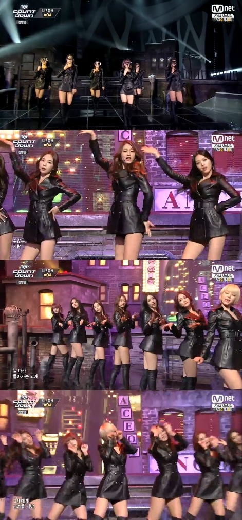 AOA는 13일 오후 케이블채널 엠넷 음악순위프로그램 '엠카운트다운'에서 섹시한 캣 우먼으로 변신해 '사뿐사뿐'을 선보였다.