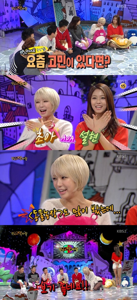 17일 오후 방송된 KBS 2TV 예능프로그램 '대국민 토크쇼 안녕하세요'에는 방송인 홍록기, 정가은, AOA의 초아, 설현이 게스트로 출연했다.