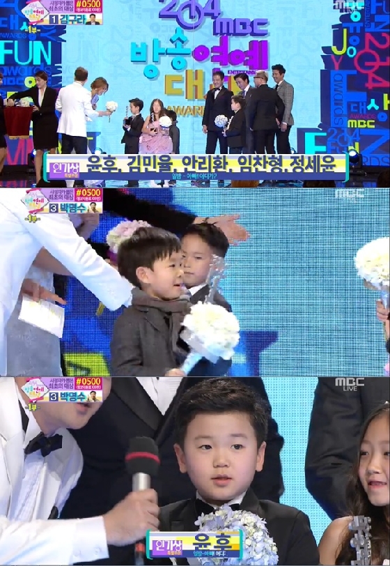 '아빠 어디가'의 다섯 아이는 29일 오후 8시55분 서울 마포구 상암 MBC공개홀에서 생방송으로 진행된 2014 MBC 방송연예대상 시상식에서 특별 부문 인기상을 받았다.