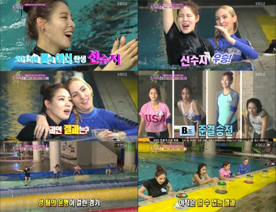 신수지가 1일 오전 방송된 KBS 2TV 예능프로그램 '출발 드림팀 시즌2'에서 브로닌을 상대로 벌인 '물길 달리기' 마지막 경기에서 0.1초 차이로 승리했다.