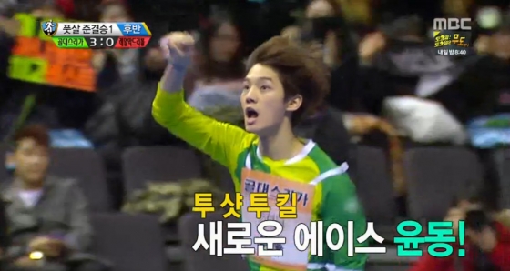 윤동은 19일 방송된 MBC 설 특집 '2015 아이돌스타 육상·농구·풋살·양궁 선수권대회'(이하 '아육대')에서 골대스리가 팀으로 출전해 전, 후반 각각 1골을 기록하며 팀의 승리를 이끌었다.