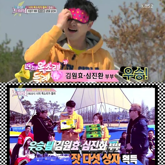 김원효과 심진화는 12일 오전 방송된 '출발 드림팀 시즌2' 황금알을 품은 부부 특집 제2경기인 '너의 목소리가 들려' 게임에서 우승을 차지했다.